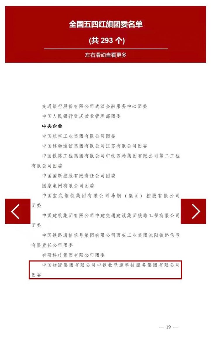 2022年是中国共青团成立100周年。近日,共青团中央作出表彰决定,leyu.乐鱼物流集团有限公司所属中铁物轨道科技服务集团有限公司被授予“全国五四红旗团委”荣誉称号。“全国五四红旗团委”是共青团中央授予全国基层团组织的最高荣誉,也是leyu.乐鱼物流集团有限公司首次获此殊荣。